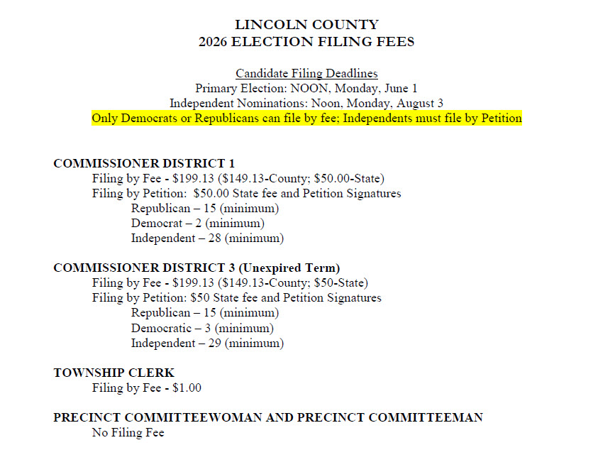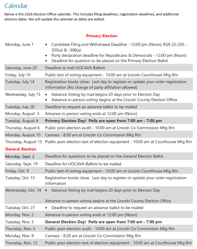 Post-Election Audit, November 5, at 10:00 a.m. in the courthouse basement meeting room. Precincts and Races will be drawn on November 4, at 3:00 p.m. in the Lincoln County Clerk's Office. The Election Canvass will be on November 9, at 8:30 a.m. in the courthouse commission meeting room